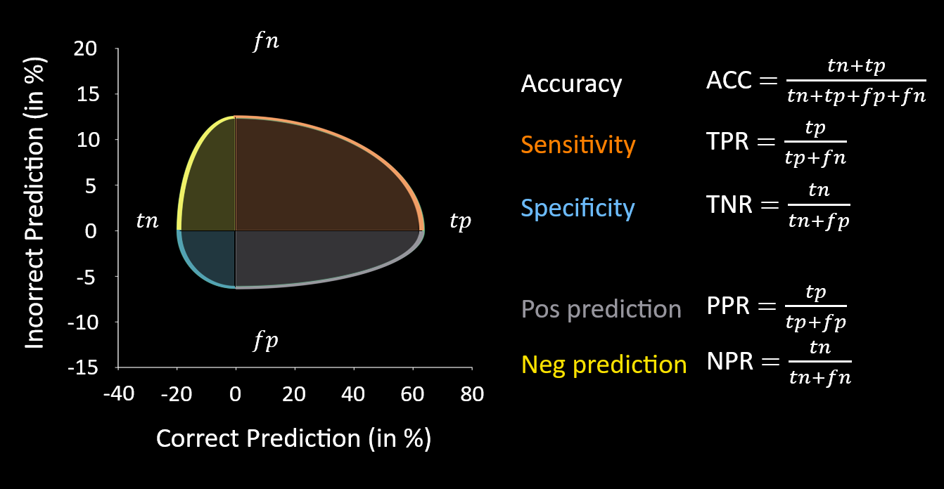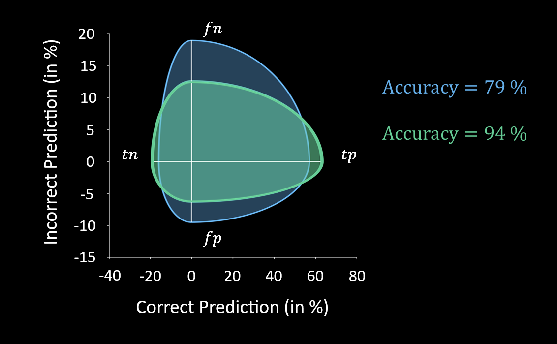 By design, Confusion Ellipses make it easy to compare classifiers at a glance. If a CE is narrower on the horizontal axis (green in the next figure), it indicates a higher accuracy compared to a wider ellipse (blue).