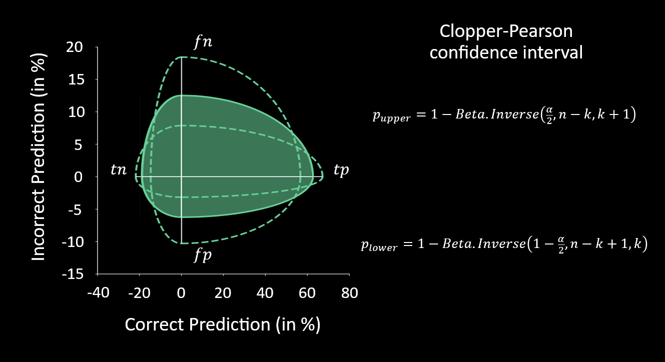 An interesting property of the CM is that it consists of two independent samples, each following a Binomial distribution: True / False (or 0 / 1). And for each distribution, we can estimate the confidence interval (like the Clopper-Pearson interval shown in the figure).
