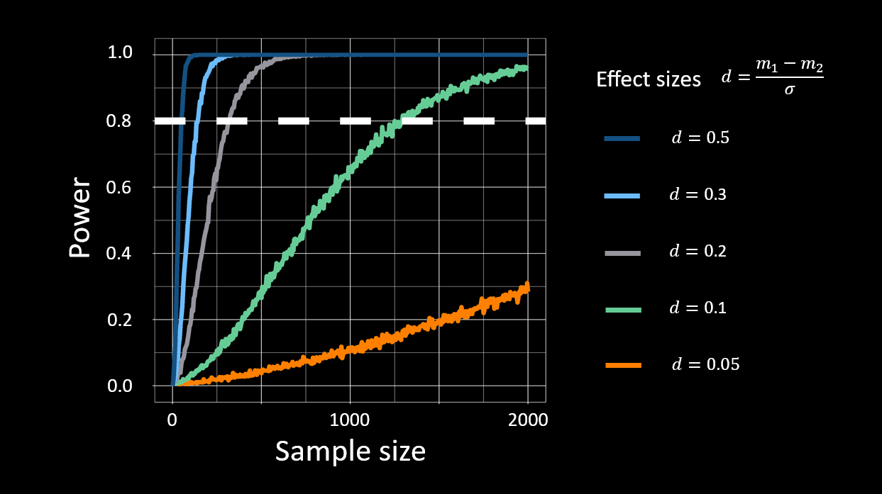 The bigger the effect, the smaller the sample size. Or in other words, if you can easily spot the signal of interest (SOI) amid all the noise, you don’t need a lot of data to be confident in your findings.